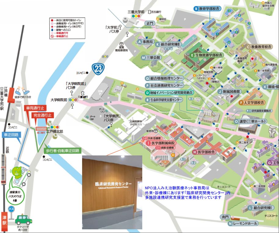 (臨床研究開発センターへは「大学病院前」下車、 または「大学病院」行きで、「大学病院」下車)